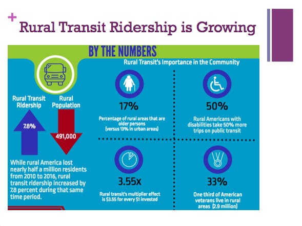SB: The transit industry is seeing growth outside of large cities. Even though the rural population has gone down, we’ve seen a 40% increase in rural transit ridership. Of these people 17% are elderly. More than 50% of these people have disabilities and use public transportation. As the older population increases, the demand for reliable transportation also increases. Chronic healthcare conditions are creating a demand for transit agencies. Over 3.6 million Americans either miss or delay healthcare appointments due to transportation. Every day, 10,000 Americans turn 65, EVERY SINGLE DAY FOR THE NEXT 10 Years!